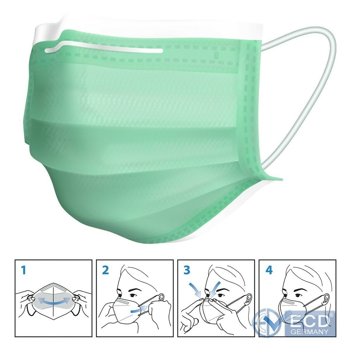 Die 3-lagige Maske aus Vliesmaterial, Filtermaterial und ultrafeinen Soft-Fasern verfügt über eine hervorragende Belüftung und lässt sich durch die dreidimensionalen Falten besonders komfortabel tragen. Die Gummischlaufen sorgen für einen sicheren Halt hinter den Ohren. Die Maske kann durch die ergonomische Passform sowohl von Männern, als auch Frauen getragen werden.