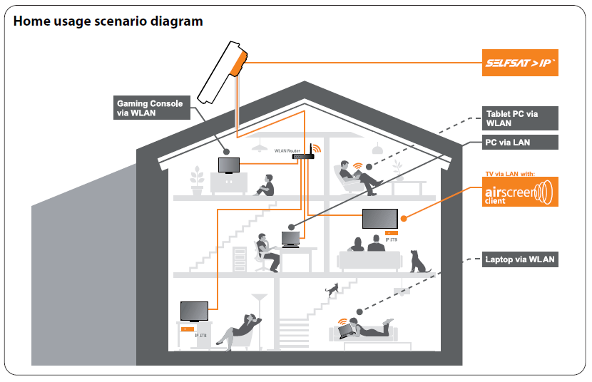 Mit der SAT>IP Flachantenne können alle frei empfangbaren Programme auf mobile oder SAT>IP-fähige Endgaräte gestreamt werden (max. 8 Endgeräte). Die SAT>IP Signale werden an den vorhandenen Internet-Router geleitet, der die Signale per LAN oder WLAN an die Endgeräte sendet. Der Router muss den Wireless Standard 801.11ac unterstützen, um optimale Bildqualität zu gewährleisten. Die Antenne bietet neben der SAT>IP Funktion auch zwei weitere Universalausgänge, die direkt mit einem herkömmlichen Receiver verbunden werden können. Die Flachantenne ist die ideale Lösung um platzsparend und unauffällig Satellitenfernsehen zu empfangen. Die flache und kompakte Bauweise macht die Flachantenne (fast) unsichtbar.