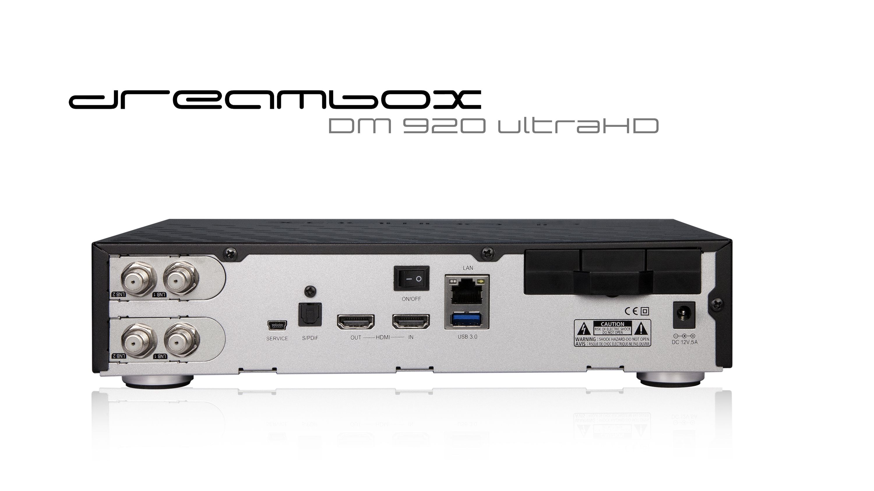 Die neue Dreambox DM920 UHD 4K ist der nächste Ultra HD Receiver von Dream. Die DM920 UHD zeichnet sich insbesondere durch sein Ultraschnellen Prozessor mit 12000 DMips, 8GB Flash und 2GB RAM (Arbeitsspeicher) aus. Sie besitzt zwei Steckplätze für Plug&Play-Tuner, so dass der Kunde die Dreambox für digitalen SAT-, Kabel- oder Antennenempfang (DVB-T/T2) nutzen kann.