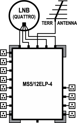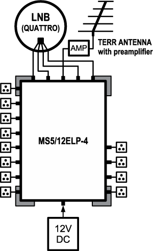 In der Standardversion ist dieser geeignet um eine Satellitenposition, sowie Terrestrik für 12 Teilnehmer zur Verfügung zu stellen. Terrestrisches Signal kann an der entsprechenden Eingangsbuchse eingspeist werden und steht dann an den Ausgängen zur Verfügung. Aufgetrennt wird das Signal SAT/Terrestrik mittels Sat-Dosen an den Endstellen.