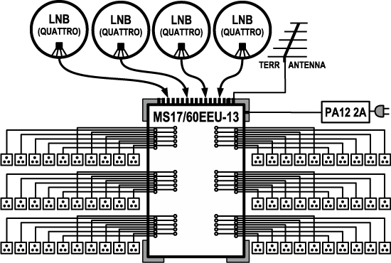 EliteLine Multischalter MS 17/60 EEU-13 mit energiesparendem Netzteil für 60 Teilnehmer und 4 Satelliten, Eingang für 16 Sat-Ebenen, 1 terrestrischer Eingang (aktiv/passiv), regelbare SAT-Eingänge, 4 Jahre Herstellergarantie