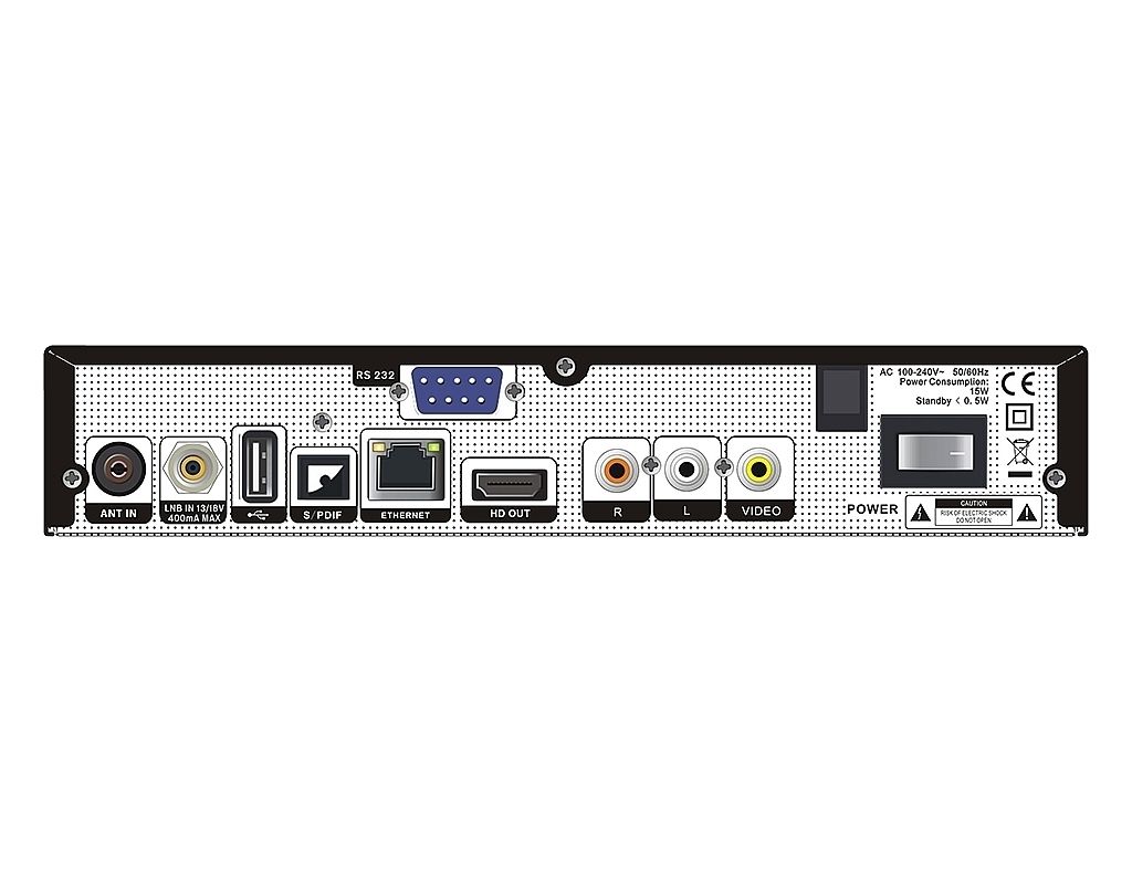 - Anschlüsse: 2x USB, HDMI, RCA, LNB IN, ANT IN, SPDIF, LAN, RS232