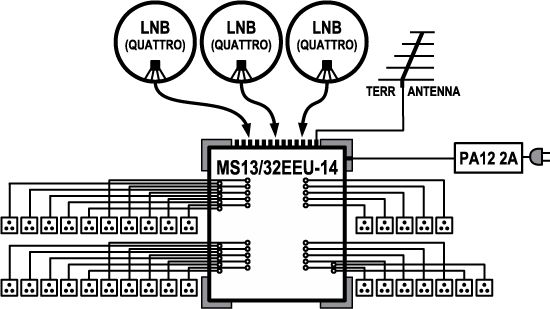 EliteLine Multischalter MS 13/32 EEU-14 mit energiesparendem Netzteil für 32 Teilnehmer und 3 Satelliten, Eingang für 12 Sat-Ebenen, 1 terrestrischer Eingang (aktiv/passiv), regelbare SAT-Eingänge, 4 Jahre Herstellergarantie