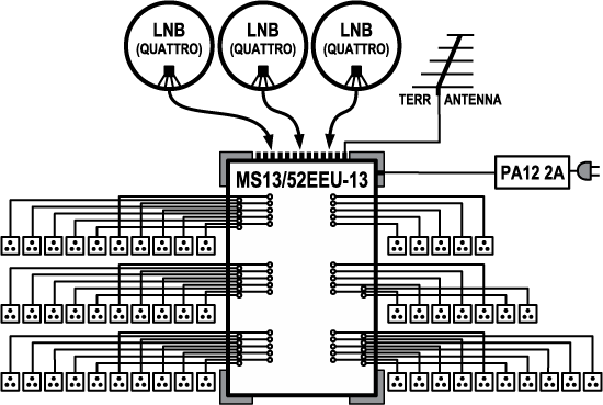 EliteLine Multischalter MS 13/52 EEU-13 mit energiesparendem Netzteil für 40 Teilnehmer und 3 Satelliten, Eingang für 12 Sat-Ebenen, 1 terrestrischer Eingang (aktiv/passiv), regelbare SAT-Eingänge, 4 Jahre Herstellergarantie