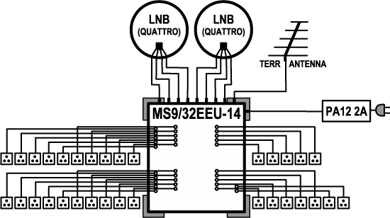 - 9in/32out standalone multiswitch for distribution of signals from terrestrial broadcasting and 2 satellites (8 SAT IF inputs) for up to 32 users.