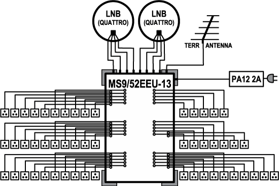 EliteLine Multischalter MS 9/52 EEU-14 mit energiesparendem Netzteil für 52 Teilnehmer und 2 Satelliten, Eingang für 8 Sat-Ebenen, 1 terrestrischer Eingang (aktiv/passiv), regelbare SAT-Eingänge.