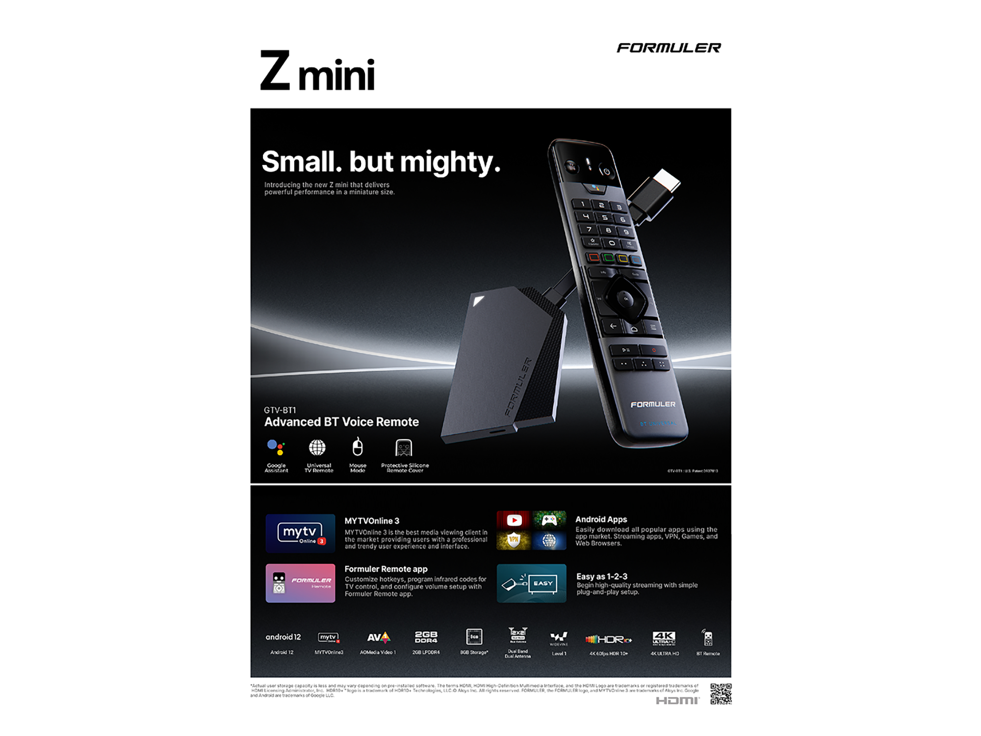 Formuler Z Mini 4K UHD Android 12 IP-Receiver Dual-WiFi, Bluetooth, HDMI, USB-C, H.265, Schwarz, BT Fernbedienung