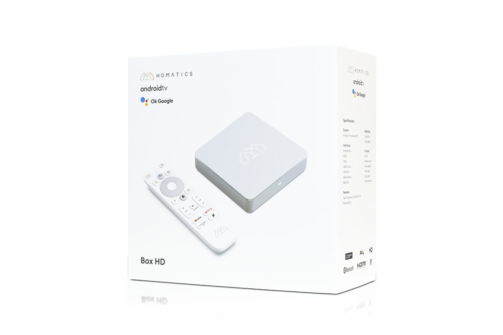 Die Homatics BOX HD ist die ideale Wahl für Fernseher mit Full HD- oder HD-Auflösung. Mit dem neuen Homatics Box HD AndroidTV Mediaplayer können Sie hochwertige Inhalte ganz einfach auf dem großen Bildschirm erleben. Mit der Sprachfernbedienung haben sie einfachen Zugriff auf den Google Assistant und können mithilfe der Kurzbefehle auf der Fernbedienung ihre Lieblingsapps aufrufen.