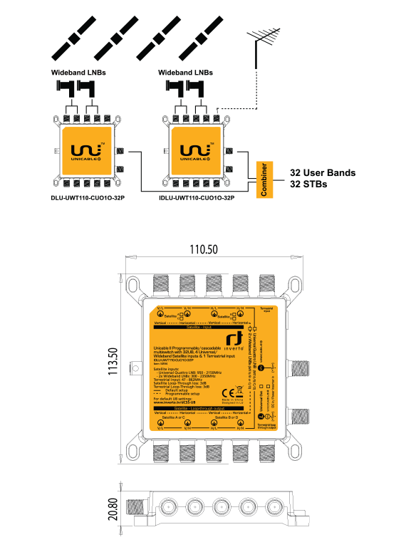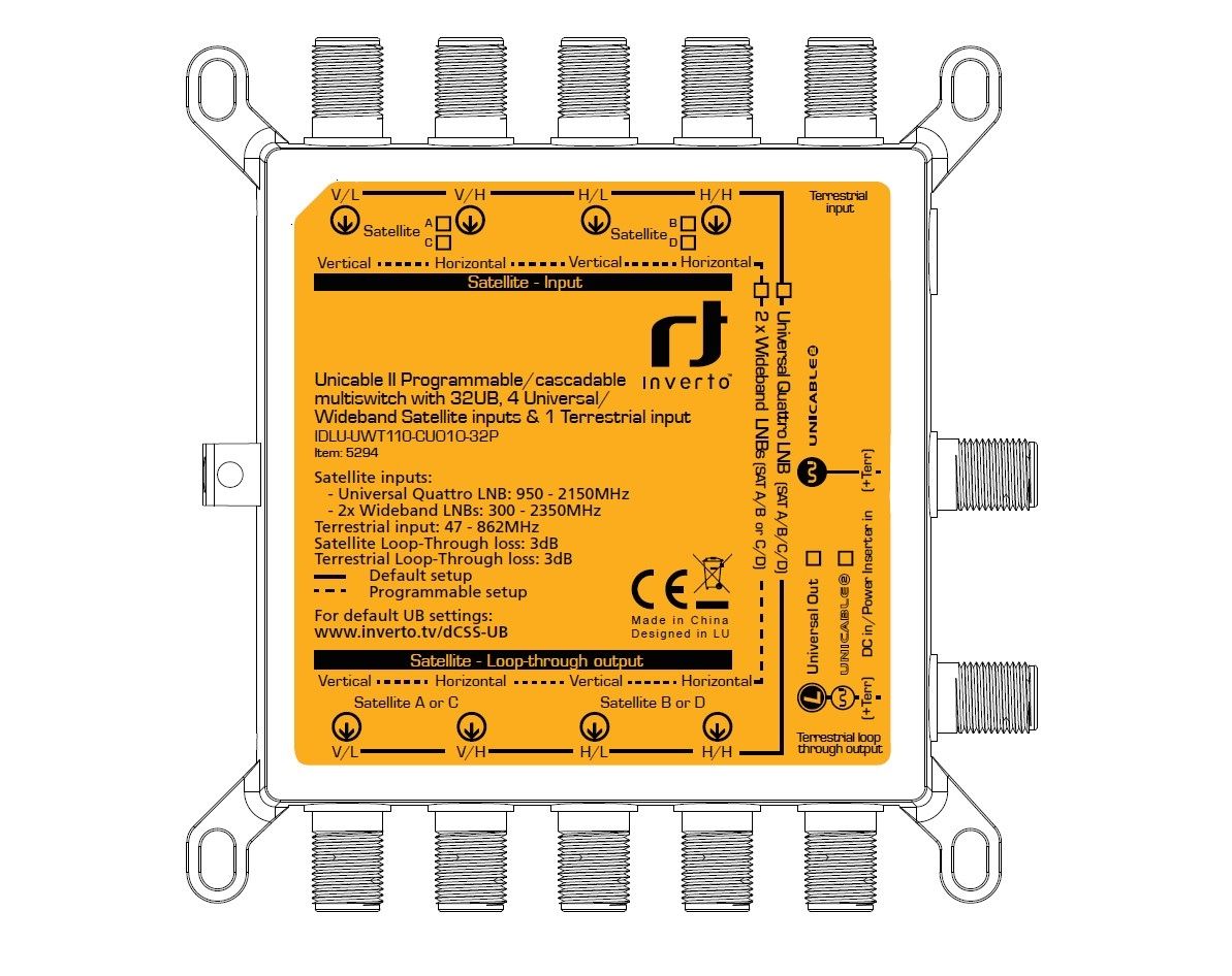 *** Der Unicable II IDLU-UWT110-CUO1O-32P Multischalter 5/32 ist für die Verwendung mit einem Quattro LNB programmiert. Sollten Sie den Multischalter mit einem Wideband LNB's verwenden wollen, senden Sie uns nach Ihrer Bestellung bitte eine E-Mail mit dem entsprechenden Hinweis.