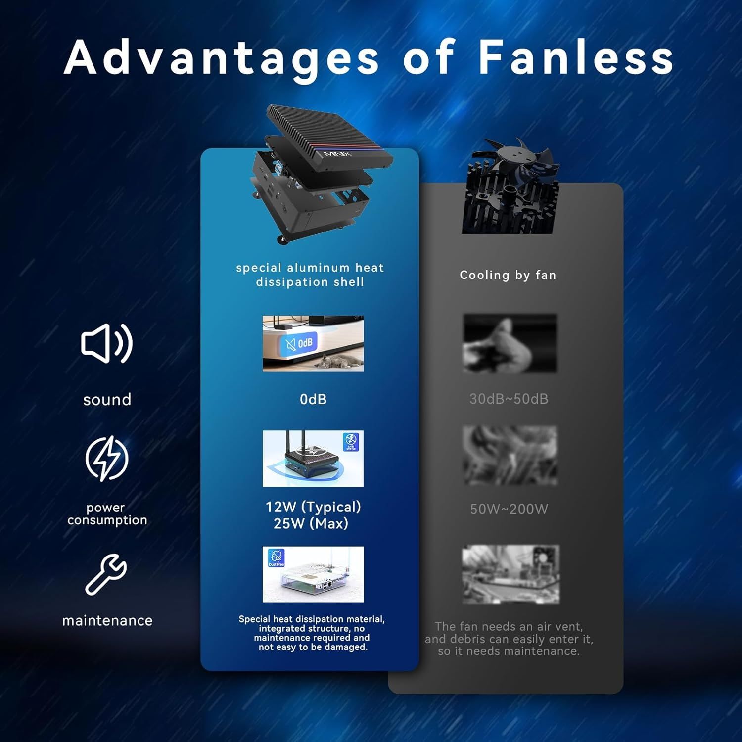 Im Gegensatz zu PCs mit aktiver Kühlung minimiert sich bei der MINIX 0dB Serie der Wartungsaufwand - Keine Reinigung verstaubter Kühler.