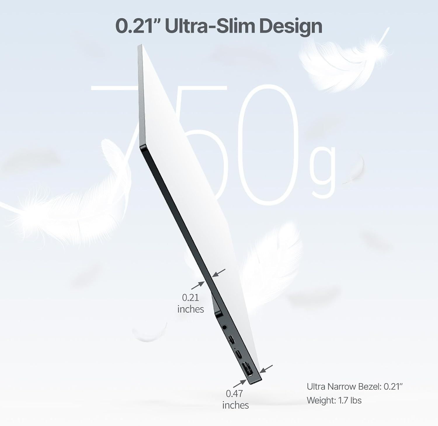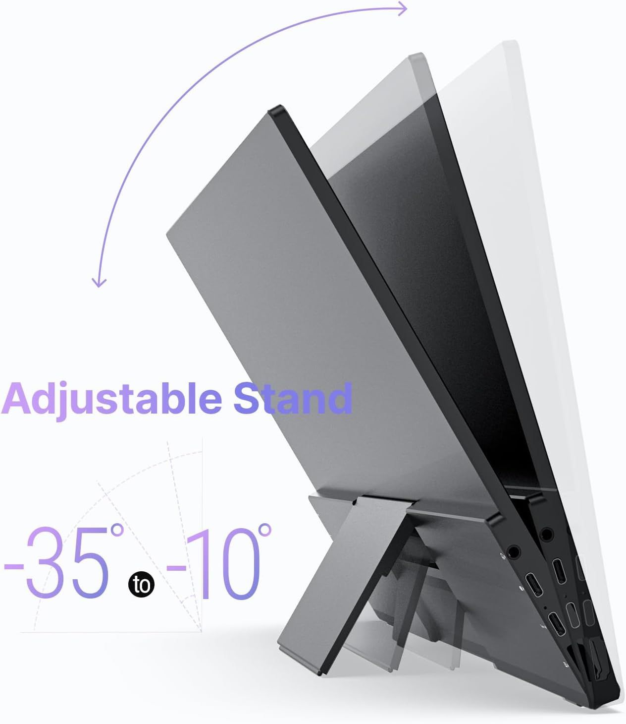 Erleben Sie die Flexibilität, aus jedem Winkel zu arbeiten, dank des anpassungsfähigen, faltbaren Displayständers. Geniessen Sie die Vorteile des kompakten, leichten und äusserst tragbaren Designs. Dank des robusten und langlebigen Gehäuses aus einer Aluminiumlegierung können Sie sich auf seine Langlebigkeit verlassen. Ausserdem ist dieser bemerkenswerte Monitor mit einem Gewicht von nur 750 Gramm aussergewöhnlich leicht.