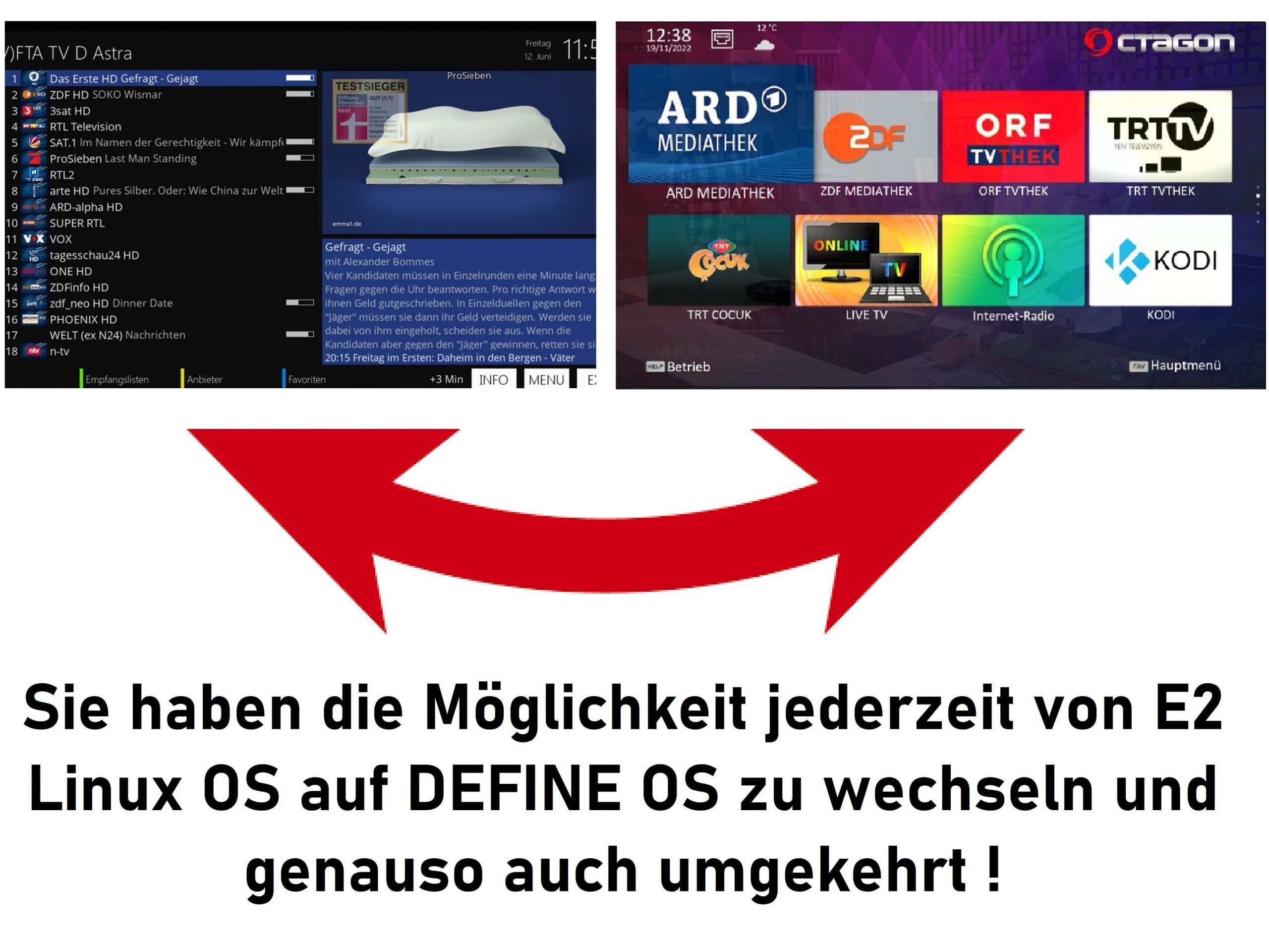 Dual OS mit E2 Linux und Define OS, 4K UHD Sat DVB-S2 Tuner, Receiver mit Aufnahmefunktion, E2 Linux OS unterstützt anpassbare Skin-Benutzeroberfläche und viele kostenfreie Plugins