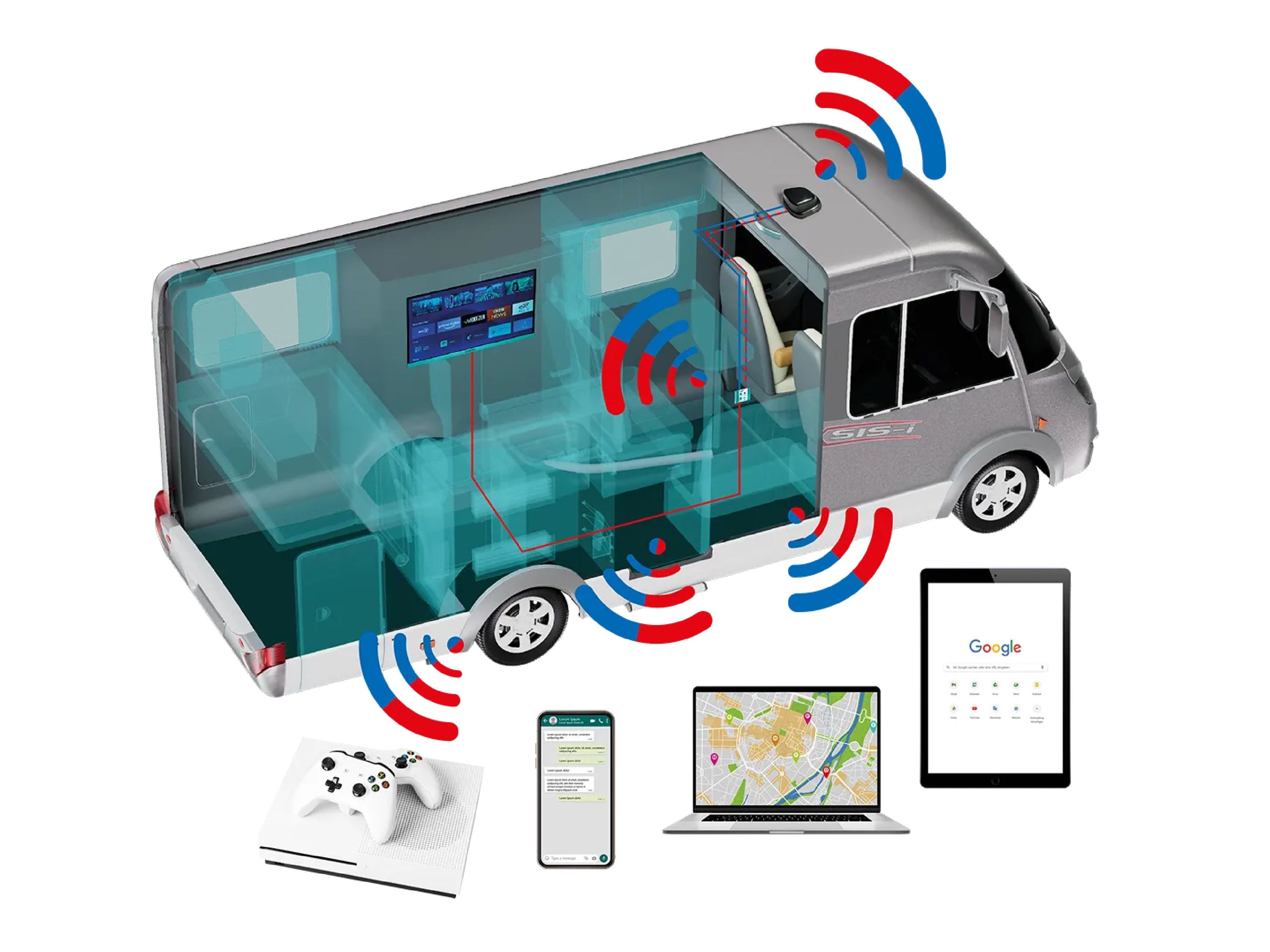 Das Herzstück ist dabei ein Internet Router, der über das 12 Volt Bordnetz betreiben werden kann und der ein eingehendes WLAN-Signal, oder dank einer eingelegten SIM-Karte ein Mobilfunknetz-Signal von außen empfangen und im Inneren des Wohnmobils oder Wohnwagens als privates, passwortgeschütztes WLAN-Signal aussenden kann. Dadurch haben Sie im Inneren ein deutlich besseres Signal, als Sie es direkt mit Ihrem Smartphone, Tablet, Laptop oder TV hätten. Darüber hinaus können Sie mehrere Geräte gleichzeitig mit dem Internet Router verbinden. Dieser hat keine SIM-Sperre und kann mit den Auflade-SIM-Karten (Prepaid) oder Vertrags-SIM-Karten (Postpaid) der verschiedenen Anbieter verwendet werden. Da er über 2 SIM-Karteneinschübe verfügt können z. B. im Ausland auch ausländische SIM-Karten zusätzlich verwendet werden. Für einen guten Empfang sorgt bei allen drei Varianten eine Außenantenne, die auf dem Camper oder Caravan montiert und mit dem Internet Router im Inneren verbunden wird.