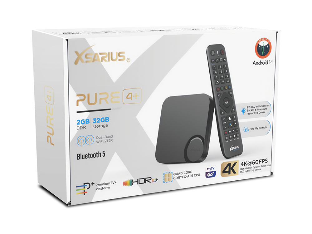 Erleben Sie mit dem Xsarius Pure 4+, der neuesten 4K-UHD-Streaming-Box, die Entertainment neu definiert, ein unvergleichliches Seherlebnis. Genießen Sie lebensechte Bilder in HDR10 + , blitzschnelle Performance dank Android 14 und Quad-Core-Prozessor sowie Bluetooth 5 für schnelle und stabile Verbindungen zu all Ihren Peripheriegeräten. Mit 32 GB Speicher und 2 GB RAM haben Sie mehr als genug Platz für all Ihre Apps und Medien.