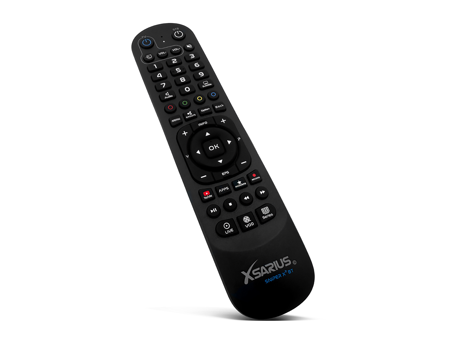 Der Xsarius Sniper X2 wird mit einer fortschrittlichen Bluetooth-Fernbedienung mit Hintergrundbeleuchtung geliefert. Diese Fernbedienung unterstützt sowohl Bluetooth als auch Infrarot und verfügt über programmierbare Tasten mit TV-Lernfunktion. Die Hotkeys ermöglichen schnellen Zugriff auf Ihre Lieblings-Apps und -Einstellungen.