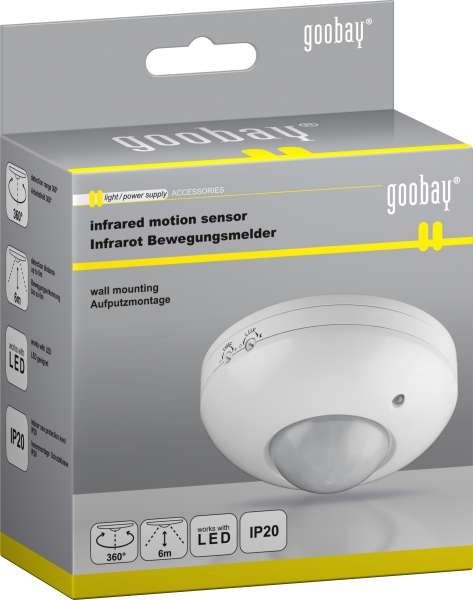 Der Goobay Infrarot Bewegungsmelder zur Aufputz-Deckenmontage schaltet das Licht im jeweiligen Raum bei Bewegung automatisch an und nach der von Ihnen gewählten Abschaltverzögerung wieder aus. Er zeichnet sich durch eine unkomplizierte Aufputz-Deckenmontage aus und ist u.a. für den Innenbereich und zur Schaltung von Lampen, Leuchten und LEDs geeignet. Mit einem Erfassungswinkel von 360° nimmt der Bewegungsmelder rundum Bewegungen bis zu einer Reichweite von 6 Meter wahr.