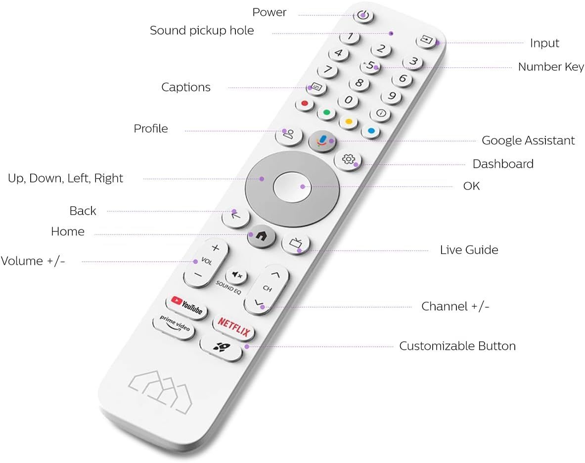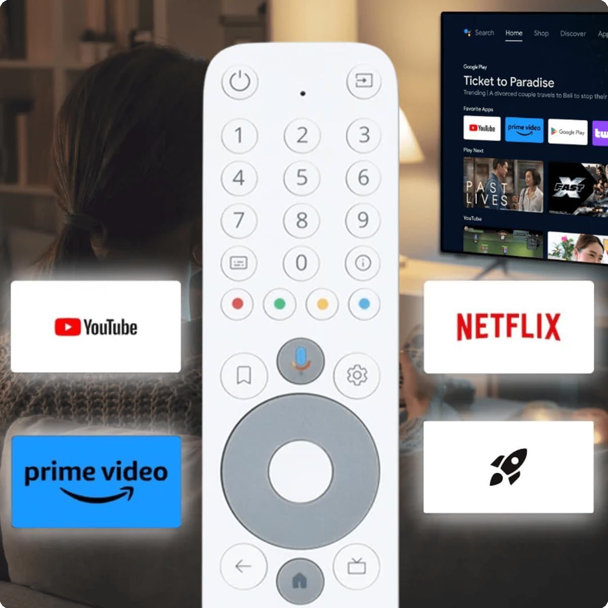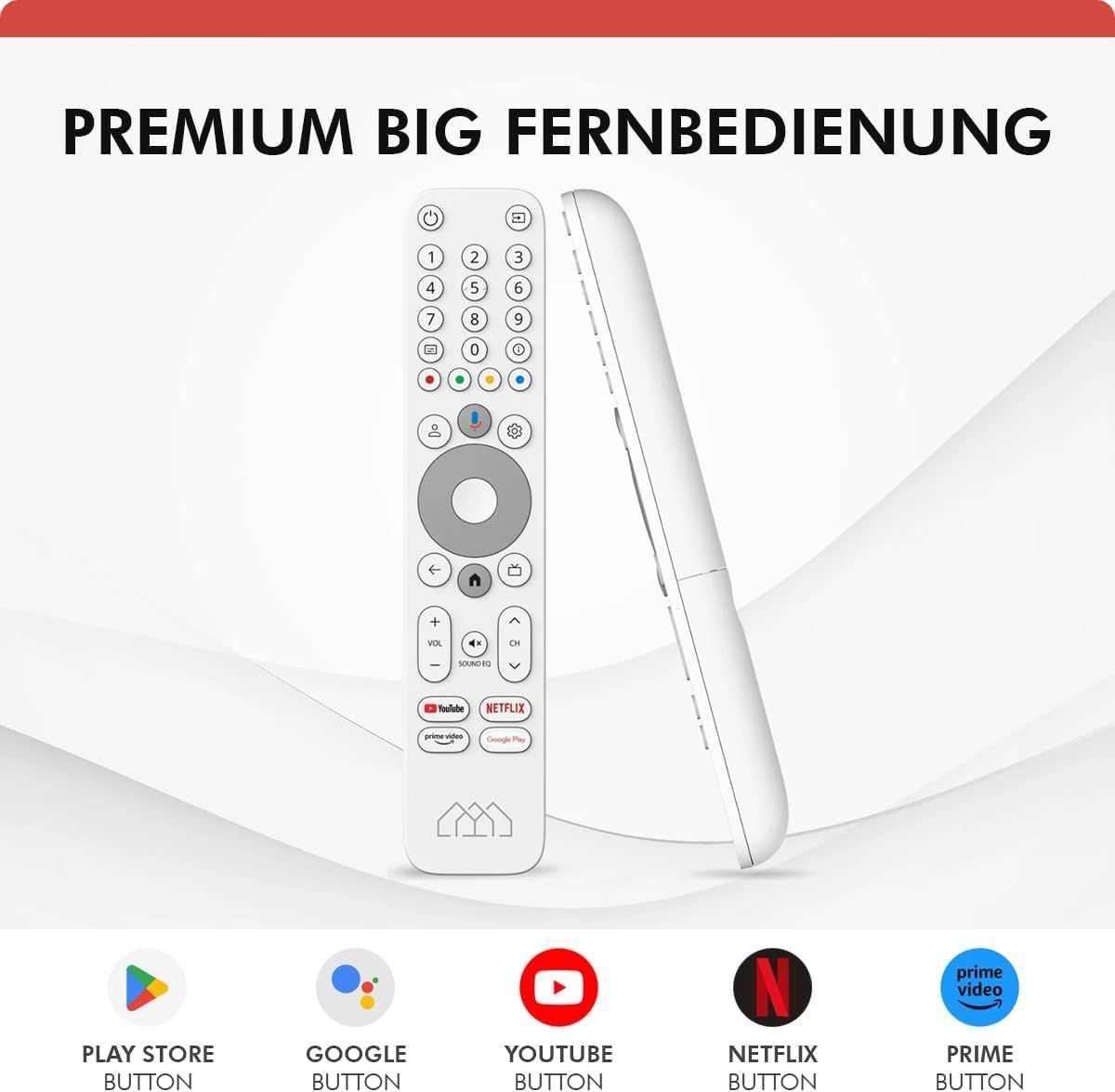Minimalistische Fernbedienung mit praktischen Funktionen, einschließlich schneller Navigation und Tasten für den Zugriff auf YouTube und Netflix.