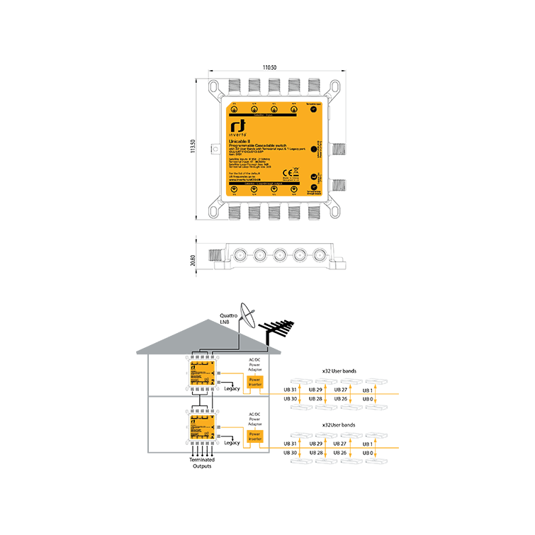 Der kaskadierbare Multischalter verteilt vier Satelliten-ZF-Bänder (L/V, L/H, H/V und H/H) und terrestrische VHF/UHF-Signale. Die Unicable-Ausgänge und die Legacy-Ausgänge werden mit dem terrestrischen Signal kombiniert. Das terrestrische Signal wird nicht verstärkt. Der Multischalter wird durch ein externes Netzteil und den Power Inserter mit Strom versorgt, was eine größere Flexibilität gewährleistet. Die Kommunikation zwischen dem Multischalter und den angeschlossenen Unicablereceivern, erfolgt nach EN50494 und/oder EN50607 und kann je User Band definiert werden und ermöglicht Installationen bestehend aus sowohl nur EN50494-fähigen oder EN50607 kompatiblen PVRs und HGWs der nächsten Generation.