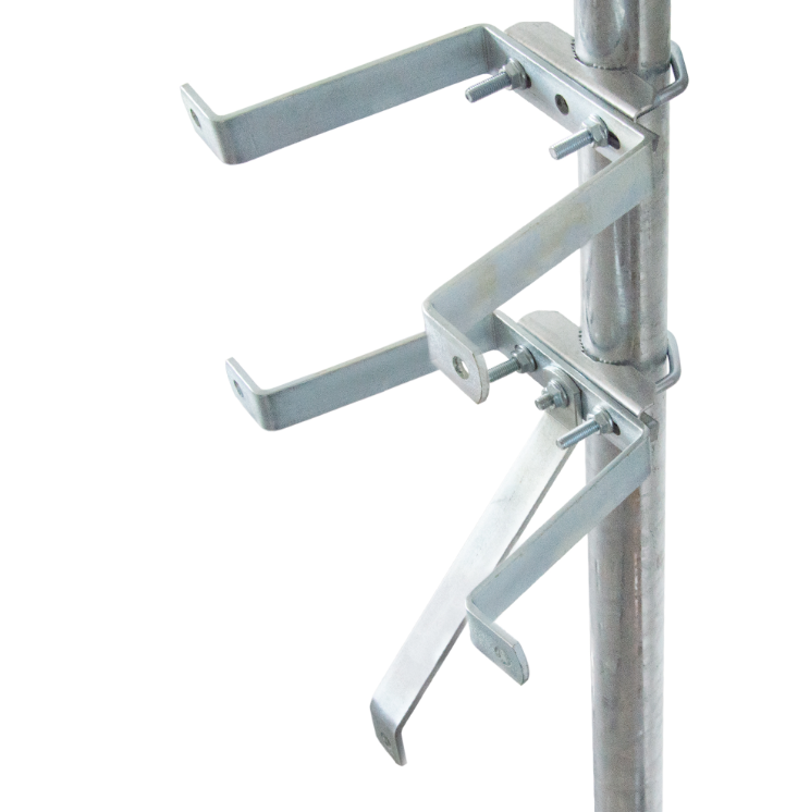 Das Set besteht aus 2 sehr robusten Traversen, zwei Zahnschellen, zwei U-Bügeln und einem dritten Arm zur zusätzlichen Stabilisierung für Mastrohre von 30-60 mm Durchmesser.