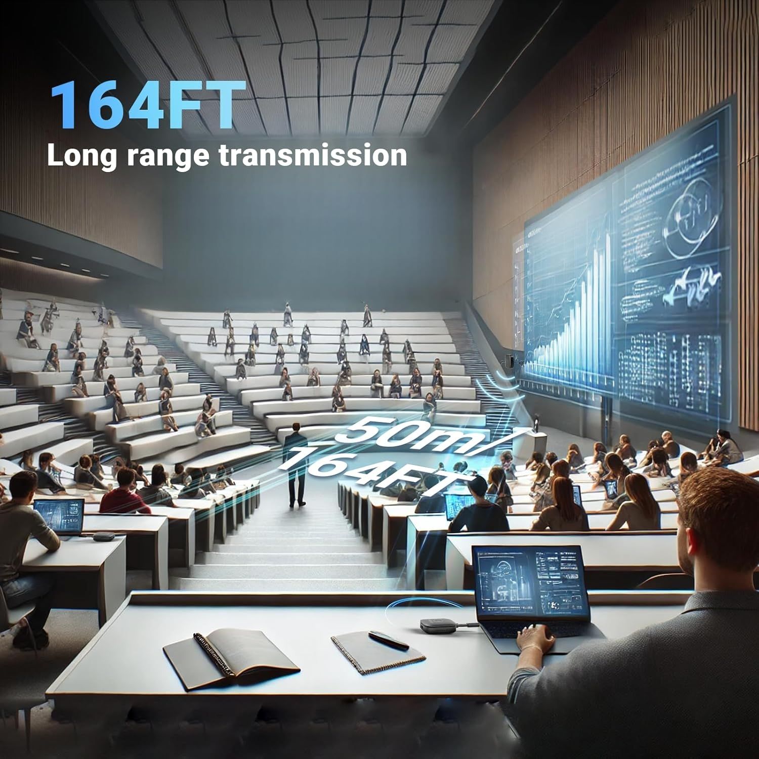 Mit einer kabellosen Reichweite von bis zu 50 Metern in offenen Bereichen können Sie die Freiheit der kabellosen Verbindung geniessen und Ihre Geräte und den Bildschirm flexibel platzieren. Der Adapter unterstützt sowohl das Wi-Fi 2.4G- als auch das 5G-Band und gewährleistet so eine stabile und schnelle Datenübertragung für reibungsloses Video-Streaming und geringere Latenzzeiten. Dies macht ihn perfekt für grosse Räume, Veranstaltungen im Freien und Präsentationen.