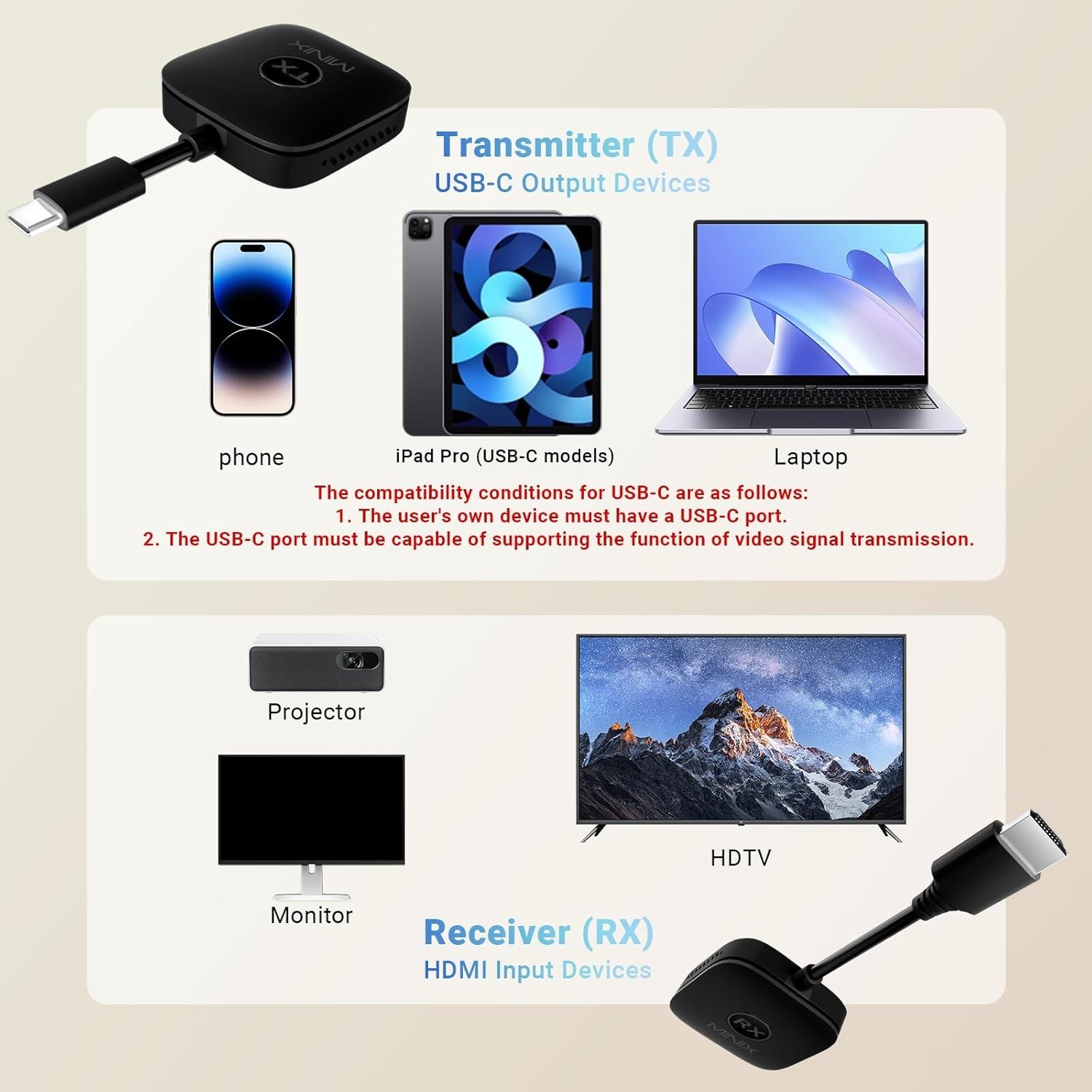 Mit den zwei USB-C-Sendern und einem HDMI-Empfänger können Sie problemlos zwei Geräte gleichzeitig anschliessen. Mit diesem Wireless-HDMI-Adapter können Sie nahtlos zwischen den Geräten wechseln, was ihn perfekt für Präsentationen, Spiele und Multitasking macht. Ganz gleich, ob Sie einen Laptop, ein Smartphone, ein Tablet oder eine Handheld-Spielkonsole verwenden, diese Einrichtung sorgt für ein reibungsloses und effizientes Benutzererlebnis.
