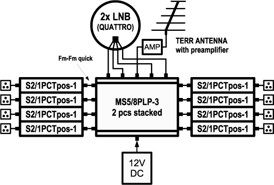 Bei Verwendung von 2 Multischaltern, sowie 8 DiSEqC- Schaltern S2/1PCT-1 können auch 2 Satellitenpositionen empfangen werden.