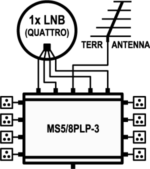 5 in / 8 out Einzelmultischalter. Geeignet um eine Satellitenposition (mit 4 Ebenen), sowie Terrestrik, 8 Teilnehmern zur Verfügung zu stellen.
