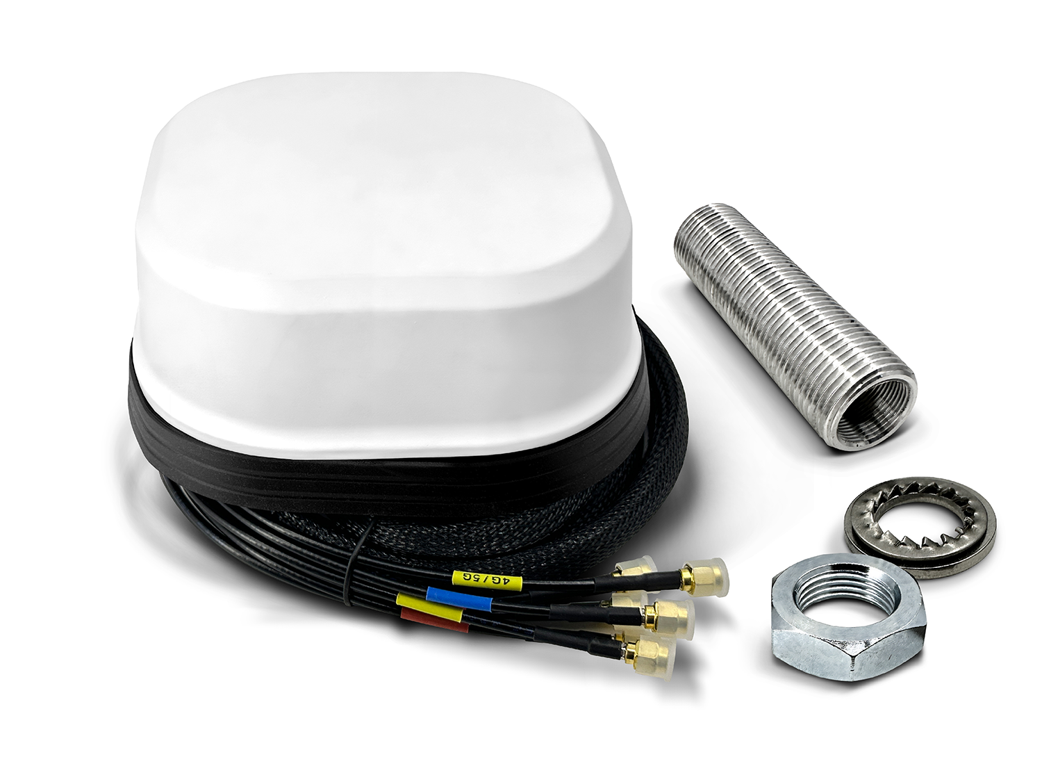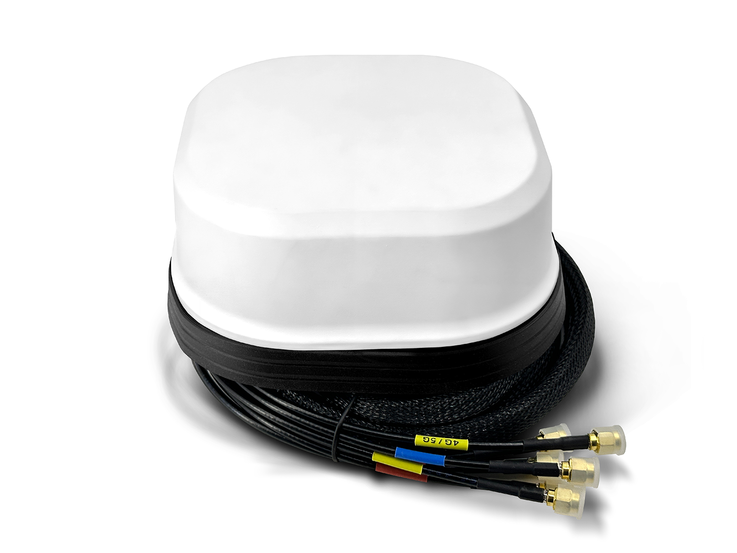 Außenantenne mit 4 Kabel für 5G / 4G LTE Mobilfunk, 2 Kabel für WLAN und 1 Kabel für GPS.